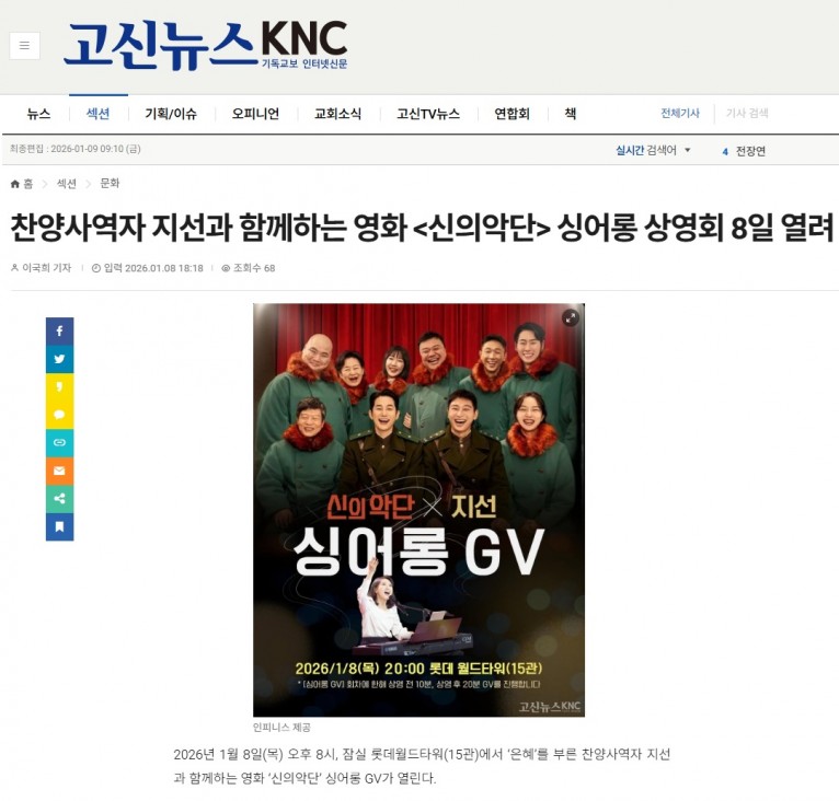 뮤직타임 [기사] 찬양사역자 지선과 함께하는 영화 신의악단 싱어롱 상영회 8일 열려(고신뉴스 KNC)