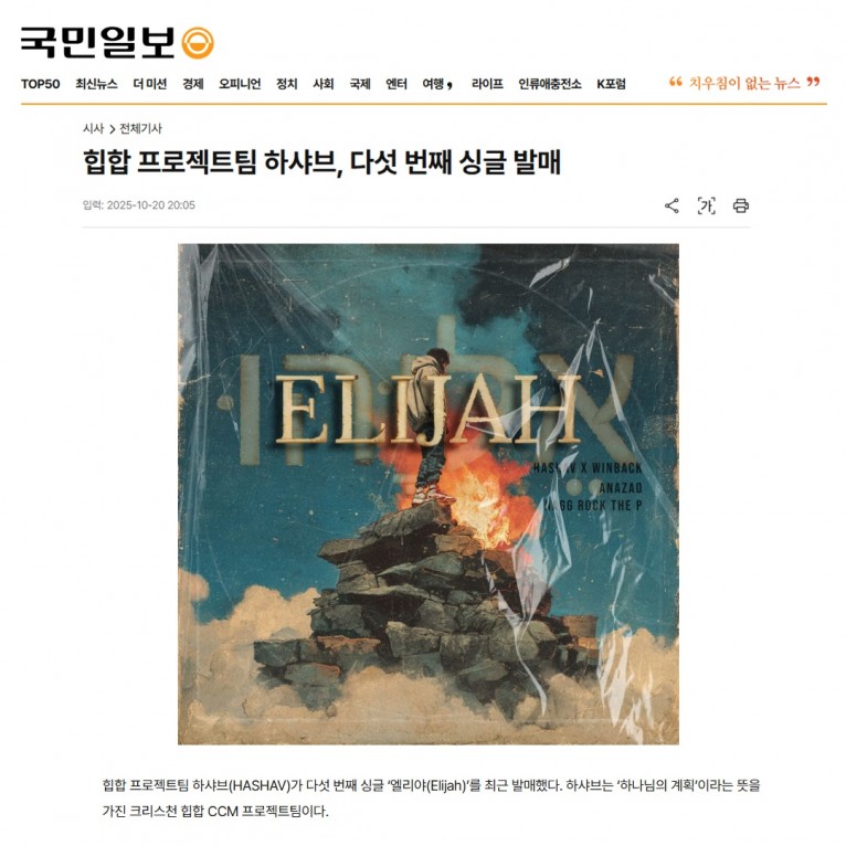 이번 앨범에는 아티스트 ANAZAO(아나자오), NAGG ROCK the P가 피처링으로 함께했다. 신곡 ‘엘리야 ’는 구약 성경 열왕기상 18장의 갈멜산 사건을 모티브로, 무너진 제단을 다시 세우고 성령의 불을 간구하는 예배 회복의 메시지가 담겼다. 하샤브는 “힙합이라는 장르에 신학적 선언을 결합해 강렬한 사운드로 완성했다”며 “잊혀진 예배, 공연처럼 변질된 예배 문화 속에서 하나님께서 여전히 불을 내리시며 공동체를 새롭게 하신다는 확신을 선포한다”고 설명했다.