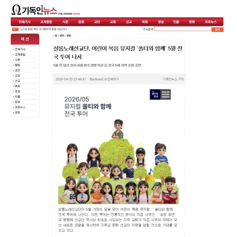 [기사] 샬롬노래선교단, 어린이 복음 뮤지컬 '쏠티와 함께' 5월 전국 투어 나서(기독인뉴스)