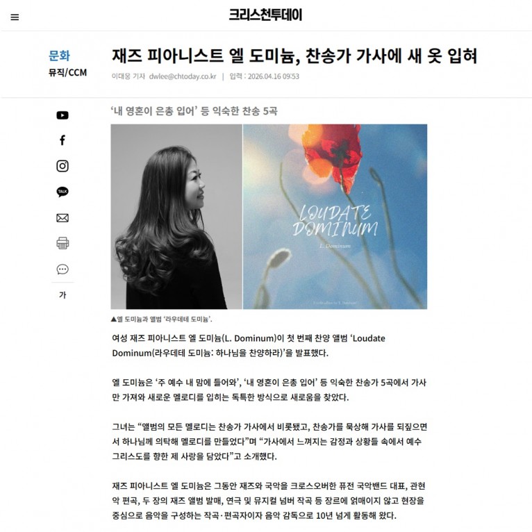 여성 재즈 피아니스트 엘 도미늄(L. Dominum)이 첫 번째 찬양 앨범 ‘Loudate Dominum(라우데테 도미늄: 하나님을 찬양하라)’을 발표했다.